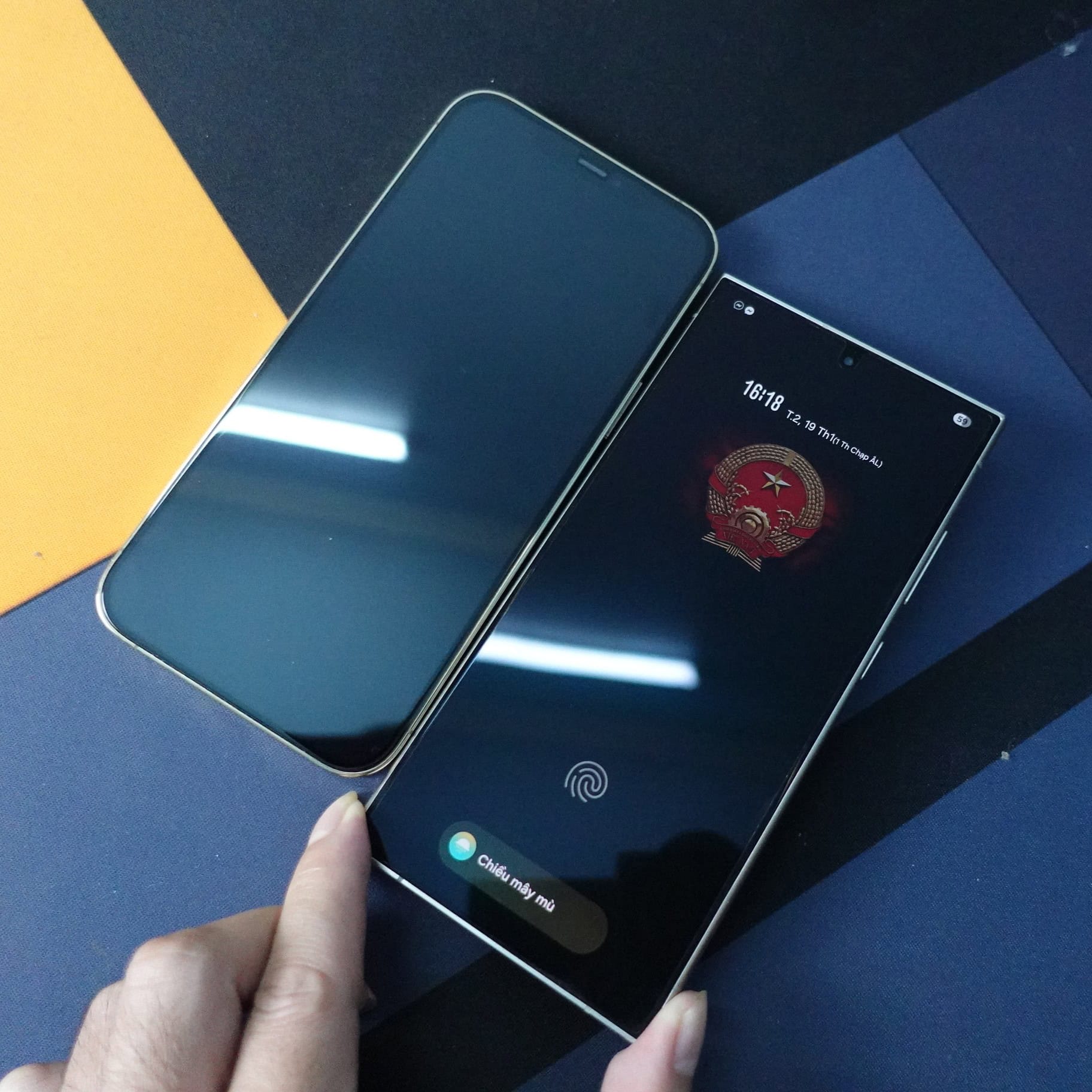 Sản phẩm có lớp phủ chống chói làm cho ánh đèn dịu hơn, các bạn có thể nhìn thấy bên máy IPhone màn hình nhìn như một tấm gương soi. Bên máy SAMSUNG màn hình đen tuyền nịnh mắt.